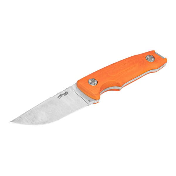 Das Blaser Ultimate Messer verfügt über eine rotierende Klinge und einer passgenauen Kydex Scheide. Die Aufbruchklinge mit ausgeballter Spitze sorgt für ein sauberes Aufbrechen des Wildes, insbesondere das Verletzen des Pansens wird dadurch verhindert. Durch den drehbaren Gürtelclip lässt sich das Messer blitzschnell und in verschiedenen Positionen am Gürtel befestigen. Dabei kann das Messer auch einhändig aus der Scheide genommen werden, beim Einstecken in die Scheide verrastet das Messer zuverlässig mit einem hörbaren „Klick“. Über ein drain-hole in der Scheide wird sichergestellt, dass z.B. Wasser nicht in der Scheide stehen bleibt und darüber abfließen kann. Das orangene Design macht das Messer gut sichtbar und hilft den Verlust beim Aufbrechen im Wald zu verhindern. Auf eine Trageöse am rutschfesten Griff wurde verzichtet, um das Öffnen des Schlosses mittels einem Schlag mit der Hand zu gewährleisten.
