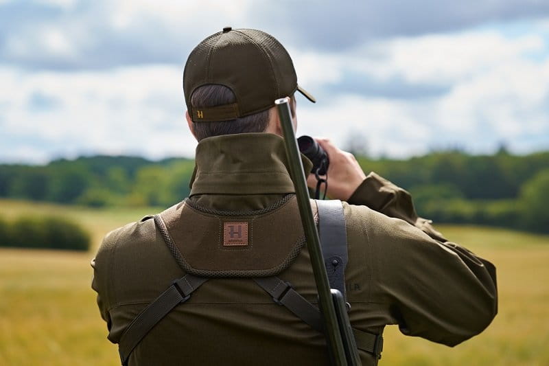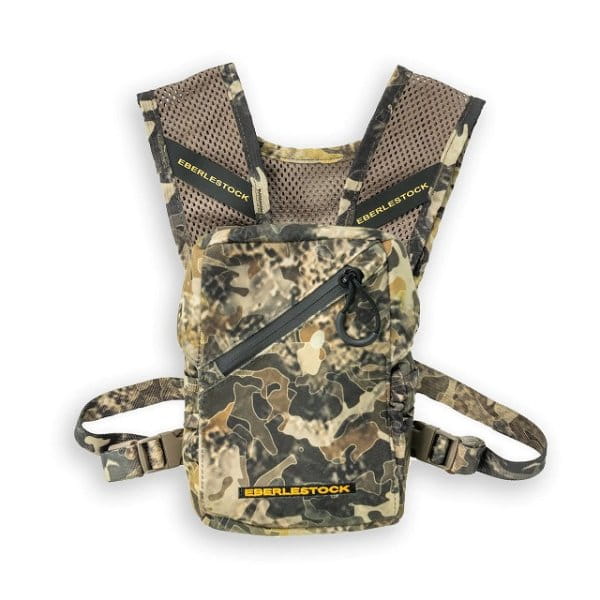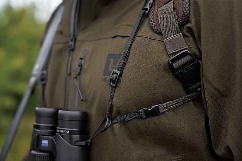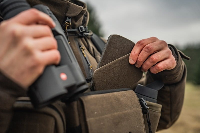 Ein ergonomischer Rückengurt mit flachem Schulterriemen garantiert ganztägigen Tragekomfort und ist mit Rucksäcken kompatibel. Praktische Aufbewahrungsmöglichkeiten wie eine Netztasche für Smartphones, eine wasserabweisende Vordertasche und elastische Seitentaschen bieten zusätzlichen Stauraum. Sicherheitsschlaufen ermöglichen die Befestigung von Entfernungsmessern oder Spottern.