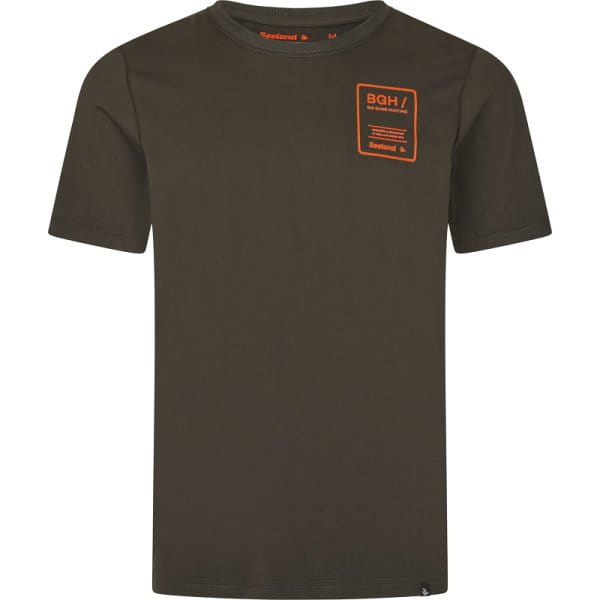 Das Shirt ist mit einem Rundhalsausschnitt ausgestattet und auf der linken Brust befindet sich ein Härkila-Logo.