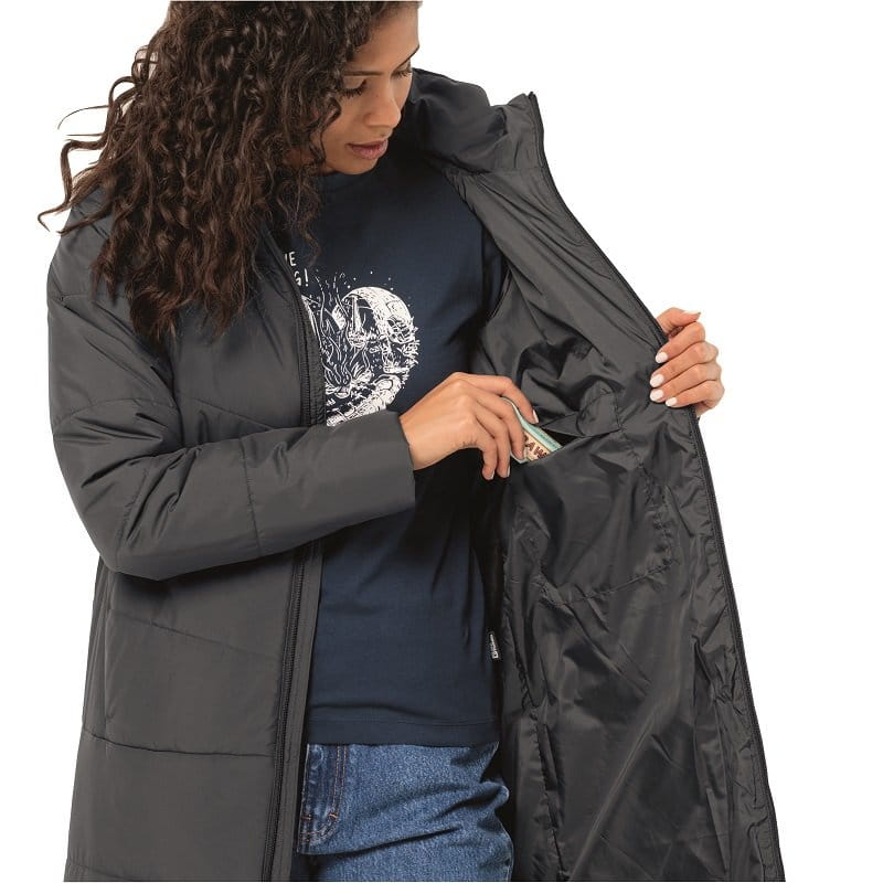 Der Mantel verfügt über zwei Einschubtaschen und eine Innentasche. Der hohe Kragen mit Kapuze bietet zusätzlichen Wetterschutz und erhöht die Gemütlichkeit. Perfekt für den täglichen Einsatz im Winter.